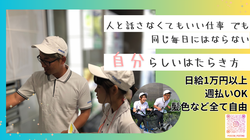 職種/仕事内容 | 仕事の内容 一人でコツコツやる方が落ち着く そんな人にぴったりなのが ポスティングの仕事です 誰かに気を遣うこともなく ノルマもなし ポストにチラシを入れていくだけの シンプルな作業 最初は体力的にきつい日もあります でも 1ヶ月ほど続けると体が慣れて 自然と効率もアップ 慣れてくると 数時間で仕事を終わらせられる ようになります だから 午前中だけ働いて午後は自分の時間に使うもよし 午後にもう1現場を回って倍稼ぐもよし 働き方を自分で選べるのが ポスCOMの魅力です しかも 希望すればいろんな街・住宅街を担当できて 飽きずに続けられます 逆に「同じエリアで慣れた道を回りたい」という人は 固定エリアでの勤務も可能 あなたの性格に合わせた働き方を選べます そして Uberや軽配送よりも安定して稼げる のが大きな魅力 案件はすべて会社が確保しているので 「今日は配達がない」なんてこともなし 希望すれば毎日でも仕事があり 安定して収入が得られます ①応募の秘密は厳守 在職中の方も安心 ② 経験者は初期研修を一部免除 スキルを即活用可能 ③ 業界平均より高水準のインセンティブ制度で 頑張りが収入に直結 ④ シフトは完全自己申告制で自由自在 【お仕事内容】 マンション等のポストへ「出前チラシ」や地域の広報誌などの投函をお任せ ノルマや力仕事は一切なし 先輩スタッフがコツや効率の上げ方を丁寧にサポートします 【 こんな人に向いてます!】 ◆一人でコツコツ作業が好き ◆人と話すのが苦手 ◆飽きっぽいけど いろんな場所で働いてみたい ◆逆に同じエリアをマイペースに回りたい ◆午前だけで仕事を終わらせたい or 午後にもう1現場で稼ぎたい ポスCOMは 業界トップクラスの高単価(1日10,000円〜18,000円)+週払いOK Uberや軽配送よりも安定して仕事があり 「今日も明日も稼げる」安心感があります 「静かに働いて しっかり稼ぐ」――そんな生き方がここにあります |