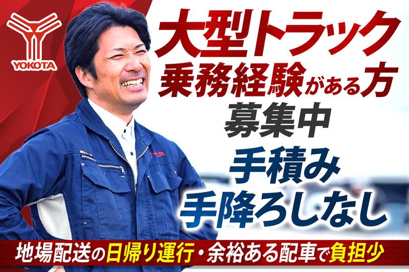 職種/仕事内容 | 【仕事内容】 \大型ドライバー募集!経験者必見!/ 大型トラックの実務経験を活かした転職に。長きにわたりご活躍いただける環境でお待ちしています! ✅最短3日で勤務開始可能! ✅借り上げ社宅制度で生活基盤を安定! ✅プライベートも充実!長期休暇あり〇 ✅業務量が安定!需要高い配送業務 ✅月収約30万円~35万円 ____________ ■具体的なお仕事内容■  ̄ ̄ ̄ ̄ ̄ ̄ ̄ ̄ ̄ ̄ ̄ ̄ 主に自動車部品の構内輸送していただきます。 【使用車両】 ・10tウイング車 【取扱い荷物】 ▶配送物:自動車部品 ▶荷役方法: ・パレット積み中心 ・パレットの場合はリフトを使用 ・手積み手降ろしなし ※体への負担も少なめです! 【運行内容】 ▶運行形態:日帰り運行 ▶配送エリア:伊丹市 ※便の内容により若干変更の場合あり ===================== 長く安心して働ける理由があります! キャリアの選択肢・しっかり管理された制度 ===================== 社会保険や有給休暇、労働時間の管理など、基本の制度をしっかり整備。安心して長く働くために確認しておきたいポイントです! さらに、在籍のまま職種を変えられる「社内転職」制度も導入。 「もっと自分に合う仕事があるかも…」そんな想いがあれば、毎月の「ワークライフパートナー」との面談で気軽に相談できます。 ===================== 経験を活かして転職を! 【夜間勤務/月給30~35万円】 ===================== 大型トラックの乗務経験を活かし、安定を実現できる環境です。 勤務は【19:00~翌4:00】。夜間の仕事だからこそ効率よく働き、確かな収入につながります。 【必須経験】 ・大型トラックの乗務経験 資材運搬・重機輸送・自社便ドライバー・イベント専属など、他業種からの転職者も多数! 夜間でしっかり稼ぎたい方に選ばれている職場です。 「経験を無駄にせず、収入をもっと伸ばしたい」──その想いを叶えられるお仕事です。 ===================== しっかり休んで、しっかり働く ===================== ムリのない運行スケジュールや、休みもしっかり取れる体制。 高速道路の活用や余裕のある配車体制で、心身に無理のない働き方を実現しています。 家族との時間や趣味の時間もきちんと確保できるよう、会社全体でサポートしています。 ================= ヨコタエンタープライズ ~社会のため、夢実現のため~ ================= 産業界の人手不足や後継者問題を解決し、日本、そして世界の明るい未来に貢献するため、成長し続ける企業を目指します。 幅広い製品を扱うことで景気に左右されにくい経営基盤を確立しており、現在では大型トラックを中心に250台の車両が運行しています。 また、社員の安心・安全が物流事業としての安心・安全につながるという観点から、Gマークの取得、的確な配車対応、全線高速道路の使用にも力を注いでいます。 一人ひとりが安心・安全に業務に取り組むことで、お取引先様の製品も早く安全に運べるように日々努めています。 【求人ID-KSD】 |