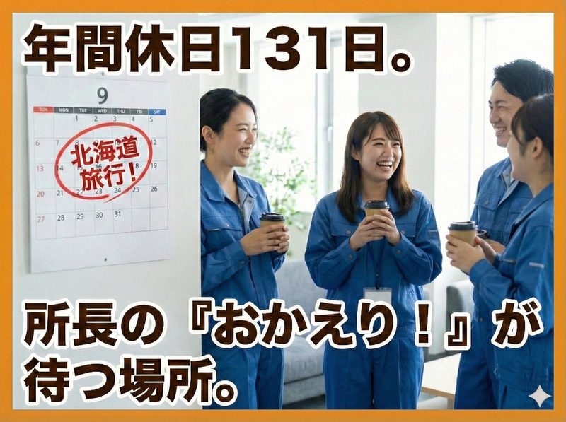休日休暇 | 休日休暇 ■完全週休2日(土曜・日曜) ■長期休暇(GW・夏季・冬季 ※いずれも9日以上) ■年間休日121日 + 有給推奨で実質131日休み ■産前産後休暇 ■育児休暇(男女ともに取得実績有) ■慶弔休暇 \おすすめポイント①/ 長期連休はいずれも9日以上の大型連休! 趣味のゲームやカフェ巡りをしたり 普段中々会えない友人と遊びに行くなど 心身をリフレッシュして過ごしています。 \おすすめポイント②/ 有給休暇は100%消化を推奨しています! 取得の申請はアプリで申請! ストレスなく取得できると好評です◎ \おすすめポイント③/ なんといっても年間休日121日! 有給取得も合わせると なんと131日休みになるんです♪ しっかりリフレッシュできる環境だから 仕事とのオンオフを切り替えて ストレスなく仕事を続けられています! |