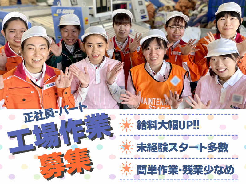職種/仕事内容 | 仕事内容 病院などで使用されるユニフォーム類(白衣やズボン等)を中心に、洗濯・仕上げを行う工場内作業です。 作業は工程ごとに分かれており、 決められた作業を黙々と進める内容が中心で、自分のペースで集中して進められます。 主な作業内容 ・洗濯する商品の仕分け作業 ・洗いあがった商品を機械に投入する作業 ・タオルをたたむ機械に投入する作業 ・仕上がった商品の出荷作業 など 家事の延長のような感覚で始められる作業が中心です。 ● 年間休日120日! しっかり休めるから、 家事・育児・学校行事との両立がしやすい環境。 無理せず続けながら、安定した収入を得たい方に最適です。 ● 9:00~18:00の日勤のみ 夜勤は一切ありません。 保育園・学校の生活リズムに合わせやすく、家庭の予定も立てやすい働き方です。 残業が発生する場合もありますが、 基本は日中勤務で無理なく働けます。 ●未経験でも安心! 特別な資格や経験は必要ありません。 「洗濯」という身近な作業なので、 久しぶりに働く方でもイメージしやすい仕事です。 入社後は先輩スタッフが、 作業を一つずつ丁寧にお教えします。 実際に、多くのスタッフが未経験からスタートしています。 安全を最優先しており、 複雑な機械操作は社内講習と認定を受けたスタッフのみが担当します。 |