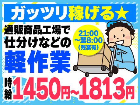 職種/仕事内容 | 仕事内容 【ガッツリ稼げる★通販商品工場で仕分けなどの軽作業】 軽い商品ばかり&簡単なピッキングばかりで未経験でも安心◎ 扱うのはSNSで話題のキッチン雑貨や日用品! 業績好調で長く活躍可能☆ 「初めての派遣」「倉庫作業未経験」からスタートした 50代までのスタッフが活躍中!男女共に大歓迎! ★即日勤務可能な案件有! |