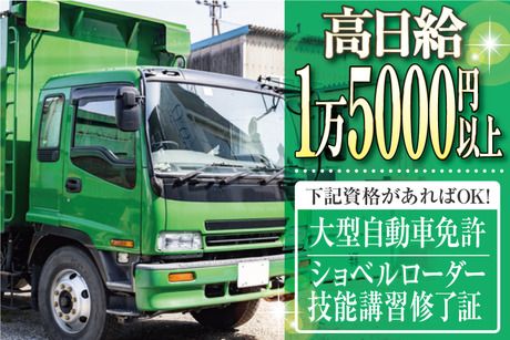 【高日給1万5千円以上】日勤のみ&7.25h勤務&土日年末年始休み♪大型&ショベルローダーの免許必須