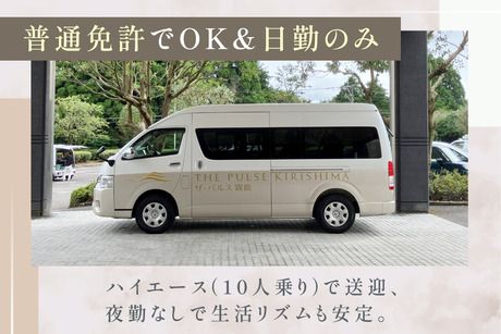 職種/仕事内容 | 仕事内容 2025年8月中旬した新ホテル~最寄駅までの送迎ドライバーを募集! 2025年8月中旬に開業の 「ザ・パルス霧島」。 霧島神宮温泉郷エリアの 雄大な自然に囲まれた 全243室のリゾートホテルです。 今回はそんな「ザ・パルス霧島」で ハイエースグランドキャビン(10名乗り)を 運転する送迎ドライバーを募集します。 ホテル~最寄りの【JR霧島神宮駅】間にて、 お客様を送迎していただきます。 ※普通自動車第一種運転免許で 運転できる車種と業務です < 業務詳細 > ■当日の送迎予約の確認 ■アルコール検査 ■車両簡易チェック (傷や清掃関連のチェック) ■お客様の送迎 ■日報記載 ~*~*~*~*~*~*~*~*~ 入社後の流れ ~*~*~*~*~*~*~*~*~ ・オリエンテーション └ 施設内案内、会社概要、ハウスルール 主な業務の説明、質疑 ・基本的な接遇レクチャー ・送迎ルートの確認、試運転 大型車(7名乗り以上)の運転経験があれば 送迎ドライバーとして働くのが 初めてでもOKです! 「ザ・パルス霧島」について 霧島神宮温泉郷にある 「ザ・パルス霧島」は、 まろやかな泉質の温泉や 霧島連峰の絶景を堪能できるロケーション。 四季折々の自然と観光資源にも恵まれ、 お客様が非日常を楽しめるのはもちろん、 スタッフ自身も心地よく働けます。 ホテルは地上9階建。 大きな露天風呂や300席を超える ビュッフェレストランを設えるほか、 霧島連峰を望めるプールや 屋内アミューズメント施設、 テニスコート、バスケットコートなども完備。 子どもから大人まで 誰もが楽しめるホテルです! 午後の時間を活用!ゆとりある働き方を。 < 13:00~18:00 > 上記の勤務時間帯の中で 1日5h~、週3日~勤務OKです。 「朝が弱いけど、働きたい」 「午前中は家事・介護で忙しい」 そんな方も、午後の時間を活かして しっかりお仕事できます! 家庭やプライベートの時間も大切にしながら、 空いた時間を活かして働きませんか? しっかり働きたい方は週5日勤務も歓迎! 世代や性別を問わず、ご活躍いただけます! 手厚い福利厚生をご用意しています! 昇給などで成長をきちんと評価! さらに、レジャー施設等の割引制度や グループホテルの利用割引など、 おトクな制度も設けています。 社員登用制度もありますので、 「もっとここで働きたい」 「上を目指したい」という方は 長期キャリアの実現を図れます! < 企業情報 > 株式会社ジャパンリゾートホテルオペレーションズは、 東京を拠点に国内各地に特色豊かな複数ブランドのホテルを 運営するソラーレ ホテルズ アンド リゾーツ株式会社のグループ企業です。 ソラーレ ホテルズ アンド リゾーツグループのホテルは、 どのホテルもアクセス抜群のロケーション、 上質なおもてなしに重点を置き、 お客様により便利で快適な環境と時間をご提供しています。 |