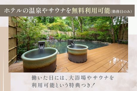 待遇・福利厚生 | 【保険制度】 雇用保険、労災保険、健康保険、厚生年金 【福利厚生】 待遇・福利厚生 【福利厚生】 *昇給あり(契約更新のタイミングで随時見直し) *交通費規定支給(上限5万円まで) *車通勤OK(駐車場あり) ※自賠責保険・任意保険加入必須 *契約社員・正社員登用制度あり *「福利厚生倶楽部」利用可(全国レジャー施設・映画館・レンタカーなど割引対象) *グループホテル利用割引 *研修制度 *当ホテルスタッフのみの特典として、 就業日の営業時間内なら、 勤務時間以外に大浴場・サウナの入浴OK! *寮・住居応相談 ※ご希望者は事前にお知らせください |