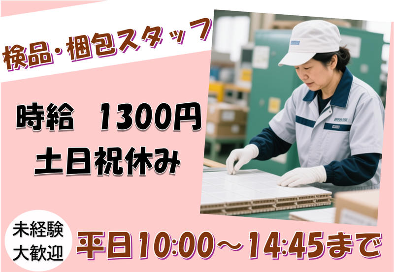 職種/仕事内容 | 仕事内容 ✅未経験OK! ✅平日のみ×短時間勤務 ✅土日祝休み(会社カレンダーに準ずる) ✅体への負担が少ない軽作業 ✅女性スタッフ中心に活躍中! ✅作業着で出勤退勤可能で時短♪ \ モクモク作業が好きな方にピッタリ!/ 清須市西堀江にある工場での メラミンタイルの検品・梱包スタッフを募集します。 - ✨電話での直接応募も大歓迎します✨ 【 052-265-5551 】 - \ココがポイント♪/ ◎扱うのは手のひらサイズの軽いタイル ◎作業は立ち作業ですが、体への負担少なめ ◎未経験でもすぐに覚えられる内容 ⭐お仕事は簡単3ステップ♪  ̄ ̄ ̄ ̄ ̄ ̄ ̄ ̄ ̄ ̄ ̄ ̄ ̄ ① 1束10枚状のメラミンタイルを確認 ② サイズ・汚れなどを目視チェック ③ 汚れがある場合は専用溶剤で拭き取り、梱包 難しい作業はなく、丁寧に進めれば大丈夫! 現在は女性スタッフが中心に活躍しています。 ⭐無理なく続けやすい働き方◎  ̄ ̄ ̄ ̄ ̄ ̄ ̄ ̄ ̄ ̄ ̄ ̄ ̄ ・採用予定人数:2~3名 ・勤務はいずれのパターンも1日2名体制 ・2名体制:平日週5日固定勤務 ・3名体制:平日5日間のシフト制(週3~4日勤務も相談可) ※採用が決まった方から就業開始。 3~4日希望の方も最初は週5日勤務となる場合があります。 勤務時間:10:00~14:45(休憩45分/実働4H) 休日:土日祝(会社カレンダーに準ずる) - ✨働きやすい環境✨ - 職場には個人ロッカーや休憩室も完備! プライバシーへの配慮も行っています。 作業着で出退勤OKなのも嬉しいポイント✨ 着替えの時間が節約できるのと、 外出の際の服装に迷わず楽チン♪ 実際にほとんどのスタッフが 作業着で通勤しています! 【 052-265-5551 】 - |