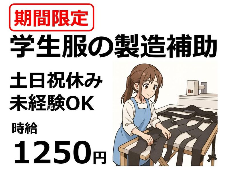 職種/仕事内容 | 仕事内容 3月末までの短期募集! 未経験OK・職場見学大歓迎♪ 学生服を製造している工場で 補助作業をお願いします! 具体的には ・生地の仕分け ・生地への番号書き ・シワを伸ばす機械への材料セット ・裁断で出た糸くずの取り除き ・型崩れ防止の生地の貼り合わせ の中から固定の作業をお願いします。 毎年、多くの方にお仕事をお願いしますが、 約1/3が未経験の方になります。 3/末までの短期につき1250円の高時給♪ 出勤日数・時短勤務も相談可能♪ ご都合に合わせて調整します◎ ★未経験OKのシンプル作業 ★短期でガッツリ稼ぐ! ★作業未経験の方も大・大・大歓迎♪ |