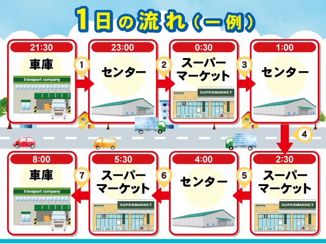 勤務時間 | 変形労働時間制 勤務時間 22:00~翌8:00 ※実働8時間 ※配送コースにより、多少変動があります。 |