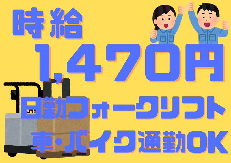 職種/仕事内容 | 仕事内容 フォークリフト(リーチ、カウンター両方あり。どちらを使ってもOK)で魚介加工品類の冷凍・冷蔵倉庫への入出庫作業(冷凍・冷蔵倉庫への入室は必要な時のみ)他検品、梱包など |
