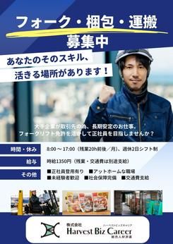対象となる方 | 資格 < 必須 > ■フォクリフト運転技能講習 < 尚可 > □実務経験者 □身体を動かすのが好きな方 □将来的に正社員になりたい方 まずは元気に挨拶ができればOK! 未経験・ブランクのある方もお気軽にご相談下さい◎ |