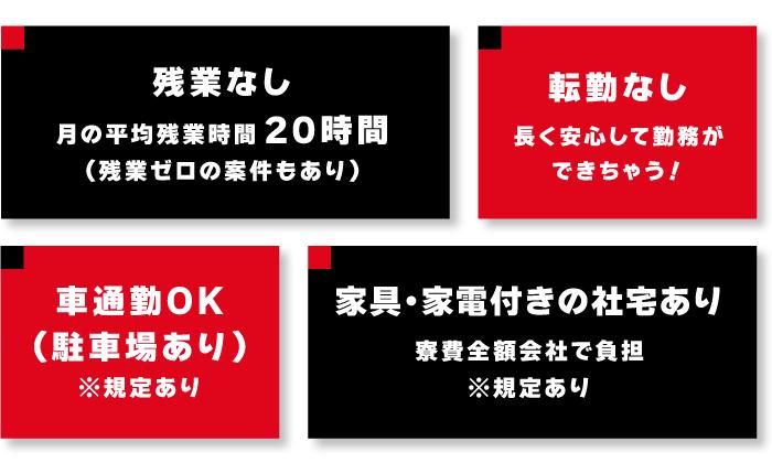 勤務時間 | 固定時間制 勤務時間詳細 実働時間:1日あたり8時間 平均勤務日数:1ヶ月あたり22日 勤務時間:9:00~18:00 ※平均残業20h ※勤務先による |