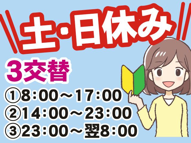 勤務時間 | シフト制 勤務時間 <三交替> 【1】8:00~17:00 【2】14:00~23:00 【3】23:00~翌8:00 *実働8時間、休憩60分 *【3】勤務→土日休み→【2】勤務→土日休み→【1】勤務→土日休みのサイクル |