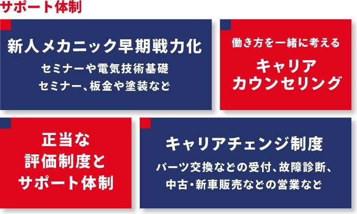 対象となる方 | 求めている人材 【ブランク・リベンジOK!実務未経験者の方も歓迎】 実務経験不問★3級以上の自動車整備士または自動車検査員資格保有者 【こんな資格活かせます】 #大型・小型・二輪自動車整備士 #自動車検査員 #自動車シャシ整備士 #ガソリン自動車整備士 #ジーゼル自動車整備士 #自動車タイヤ整備士 #自動車電機整備士 #自動車車体整備士 ○メーカー資格をお持ちの方(国産技術検定・輸入車テクニシャン・マイスター等) <こんな方は優遇> ○整備士経験のある方(年数不問・ブランク歓迎) ○整備士から他職種にキャリアアップしたい方 |