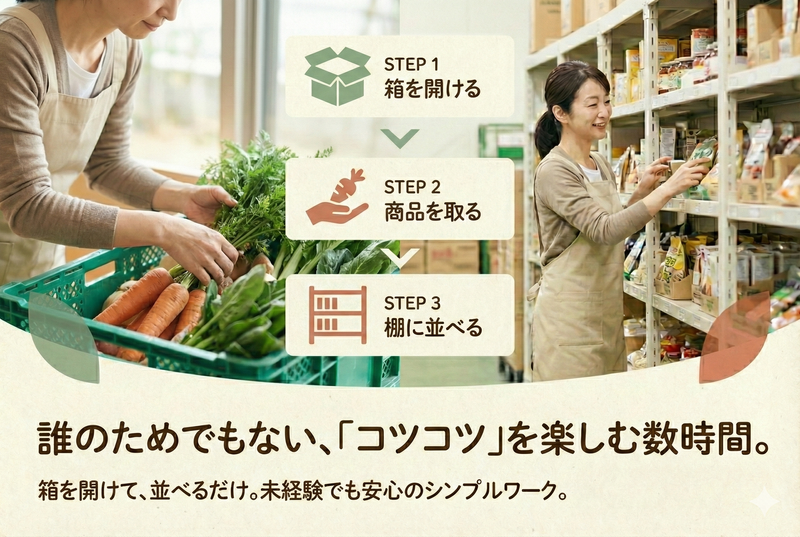 職種/仕事内容 | 仕事内容 << 人気のコツコツ・モクモク作業 >> ┏━━━━━━━━━━━━━━━━━━┓ ⭐Wワークとしても働きやすい曜日固定♪ ⭐工場でのお仕事が初めての方も大歓迎! ⭐フルタイムで勤務できる方歓迎! ⭐扶養内勤務も可能!主婦さん活躍中♪ ⭐久々のお仕事復帰も応援します! ┗━━━━━━━━━━━━━━━━━━┛ / コープ自然派で働こう! \ 野菜・果物・牛乳などの食材を扱う 倉庫内でのカンタン軽作業です。 最初は先輩スタッフのそばで ・仕事の流れ ・倉庫内での動き方 ・荷物の扱い方 を一つずつ丁寧に教えます◎ ✨1~3ヶ月でひとり立ちが目安 ✨習熟度に合わせてサポートするので 軽作業デビューの方も安心! 【 具体的には・・・? 】 ◆ピッキング作業 ◆商品の補充作業 ◆その他、倉庫内軽作業 ◎食材が入った箱を 大きな棚の空いているスペースに 補充していくだけ! \ 上記以外のお仕事も・・・! / ◆ピッキングしやすいように 箱をカッターで切る・別の箱に入れ替える ◆ピッキング後の箱を積んでいく作業 など ⇒シンプル作業が中心です! ――――――――――――――――――― ✨20代~50代の女性スタッフ活躍中 ✨両立して働く主婦(夫)さんも活躍中 ✨学生さん・フリーターさんも在籍! ✨未経験スタートの方が多数在籍◎ ――――――――――――――――――― |