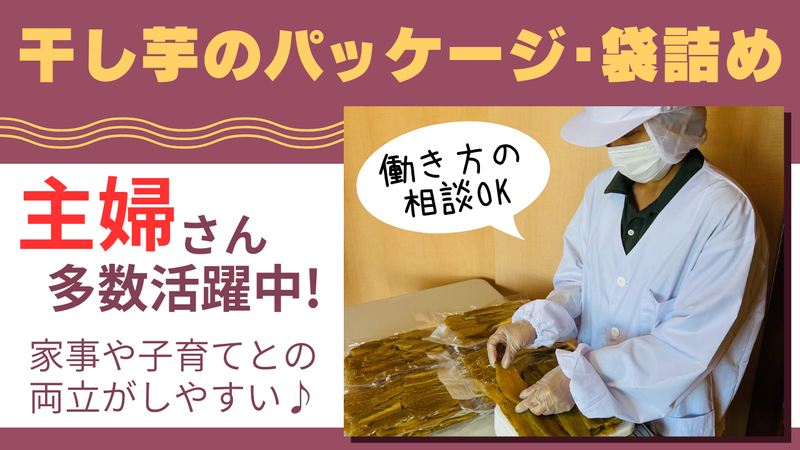 職種/仕事内容 | 仕事内容 ========================= 家事や子育てなどプライベートと両立可能♪ 年末年始だけの短期勤務やスキマ時間で 働きたい方にもピッタリです! ========================= 通販サイトなどで販売される干し芋の ・シーラー作業(袋の口を閉じる) ・袋詰め・検品 ・ラベル貼り など、 軽作業をお任せします。 (搬入・運搬補助あり) 作業はマニュアルも完備されており、 単純作業が中心なので、 未経験の方もすぐ慣れます♪ 「年末年始に少しだけ働きたい」 そんな希望も歓迎します。 === 20〜50代の幅広い年代の主婦さんが 中心に活躍中の職場です!! 「子どもが学校に行っている間だけ」 「家事の合間に少しだけ働きたい」 そんな働き方にピッタリ◎ 家庭優先でOKだから、スキマ時間を 活かしたい方にも最適です。 お子さんの体調不良など、 急なお休みもみんなでフォロー◎ 家庭との両立を一番に考えてくれる、 あたたかい雰囲気の職場です♪ |
