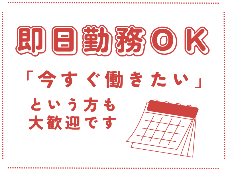 選考プロセス | 選考プロセス 1. まずはお電話またはWEBからご応募を。 2. 面接の日程を調整いたします。 3. 面接を実施し、合格された方は採用。 面接日や勤務開始日はご相談ください。 面接時には履歴書をご持参ください。 ※面接1回 ※選考結果は7日以内に連絡 |