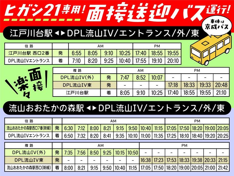 選考プロセス | 選考プロセス <選考の流れ> [1]応募/電話でのご応募も大歓迎! [2]書類選考 [3]面接(1回)/履歴書(写貼)持参 [4]採用 ✅職場見学も可能です ・職場見学は30分程度 ・業務内容や職場の雰囲気などをご案内します ・見学後にそのまま面接へ進むことも可能です ⭐面接・職場見学ともに 来社時は私服・お車・お子様連れOK! ⭐ハローワークで求職中の方も歓迎! \画像長押しでダウンロード可能/ ★画像4枚目 └面接会場の地図 ★画像5枚目 └面接時に利用可能な送迎バスの時刻表 事前にチェックしておくと安心です◎ ⭐託児所利用希望の方⭐ 下記より事前にお問い合わせいただくとスムーズです。 ■ママスクエアHP 問い合わせフォーム https://www.mamasquare.co.jp/hoiku/hoiku_contact/ ※「ながれやまsora」をご選択いただき、お名前・ご連絡先等と 「ヒガシトゥエンティワンで就業希望」と詳細欄にご記入いただければ、 折り返しご連絡させていただきます。 |