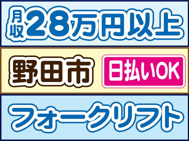 職種/仕事内容 | 仕事内容 大量募集のため積極採用中 フォークリフトの資格・経験が活かせる 50代60代の中高年・シニアの方も活躍中 「フォークリフトのポイント」 〇資格が活かせます 〇高時給1500円 〇夜勤のみ(夕方スタート) 〇土日祝休み 〇月収28万円以上 〇20代30代40代50代60代前半の男女活躍中 〇梅郷駅より送迎あり 〇日払いOK(規定内) 〇交通費支給(規定内) 〇履歴書不要 〇「マイリク定着支援」導入企業 【フォークリフトの仕事内容】 野田市にある物流センター内でのお仕事 具体的には… ・リーチフォークリフトでの飲料水などの入出庫 ・ピッキング をメインにお願いします 資格を活かして働けるチャンスです フォークリフト7~8割 ピッキング2~3割です。 残業も1~2時間程度あるので稼げます! 30分~1時間程度の職場見学を実施しております 少しでも気になったらお気軽にご応募ください 【勤務について】 〇夜勤のみ/17時~翌2時(実働8時間) 残業1~2時間あり 〇土日祝休みの週休2日制 急な発熱・体調不良・冠婚葬祭など、 突発的なお休みに柔軟に対応しております。 【経験活かせます!】 〇倉庫内作業パート・アルバイト 〇ピッキング・仕分けパート・アルバイト 〇フォークリフトオペレーターパート・アルバイト 〇入出庫・出荷準備パート・アルバイト ブランクある方もOKです! 物流会社や貿易会社での 経験を活かして働けます コーディネーター・定着支援のWサポート体制導入 「マイリク定着支援」導入企業! アンケートで職場の様子を確認し、 コーディネーター・定着支援担当が連携してサポート。 はじめての派遣でも安心して働けるよう迅速かつ 丁寧にサポート対応いたします。 ご不明な点はお気軽にお問い合わせください。 お電話でのご応募も受付中 株式会社ロフティー柏サテライトオフィス TEL0800-222-6888(フリーダイヤル) 採用担当まで お仕事情報などはこちら https://entori.jp/lofty-kashiwa |