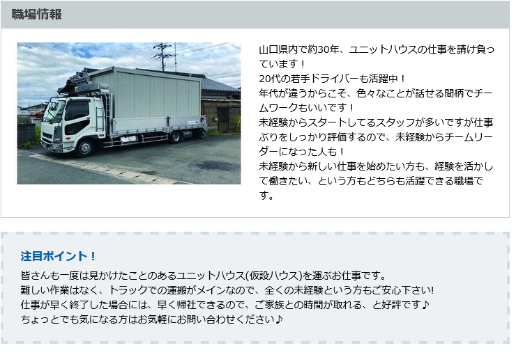 職種/仕事内容 | 仕事内容 ▼働きやすい理由&魅力▼ ✅年間休日120日以上!土日祝休みも可能でプライベート充実✨ ✅GW 夏季 年末年始 休暇あり ✅資格取得支援制度あり!玉掛け・クレーン等の費用は会社負担 ✅地場配送のみ!長距離運転なしで毎日家に帰れます ✅選べる2つの業務スタイル(ユニットハウス運搬or鋼材運搬) ✅鋼材運搬はリフトやクレーン使用で力仕事少なめ! ─┘─┘─┘─┘─┘─┘─┘─┘─┘ 【業務内容】 山口県内を中心とした地場エリアにて、2t~4tトラックを使用した「ユニットハウス」または「鋼材」の配送業務をお任せします。入社後は希望や適性に合わせて、どちらかのチームに配属となります。 ▼ 具体的なお仕事 ▼ ・ユニットハウス(仮設建物)の現場への運搬および設置作業 ・建設現場や鉄工所への鋼材のルート配送(山口県内の地場メイン) ・クレーンやフォークリフトを使用した積み込み・積み下ろし作業 ・配送先での簡易的な組み立て作業(ユニットハウスの場合) ・車両の日常点検および安全確認 ✨経験ゼロでもこれで安心✨ 1.入社後3ヶ月間は先輩社員が同乗し、運転技術や作業手順をマンツーマンで指導します。 2.玉掛けや小型移動式クレーンなど、業務に必要な資格は会社の費用負担で取得可能です。 3.配送エリアは山口県内の地場が中心なので、道を覚えやすく、長距離運転の不安もありません。 <<他にはない、ここで働く魅力✨>> 1.「運送業では珍しい年間休日120日以上」 →完全週休2日制(鋼材運搬)や週休2日制を導入しており、 GWやお盆、年末年始の休暇もしっかり確保できます。 家族との時間や趣味の時間を大切にしながら働ける環境です。 2.「体力的な負担を軽減する作業環境」 →鋼材運搬では天井クレーンやリフトを使用するため、 重い荷物を手で積み下ろす作業はほとんどありません。 ユニットハウス班もチームで協力して行うため、 無理なく長く働ける環境が整っています。 3.「地域社会への貢献と達成感」 →ユニットハウスの組み立てでは、 何もない場所に1日で建物が完成する瞬間立ち会えるため、 大きな達成感を味わえます。 地元の風景を作り上げる、 やりがいのあるお仕事です。 【将来的に身につけられるスキルや職位など】 まずは中型ドライバーとして基礎を固め、 玉掛けやクレーン等の国家資格を取得していただきます。 将来的には、より大型の車両や特殊車両へのステップアップも可能です。 また、実力がつけば運行管理や新人教育を担うリーダー職、 管理職へのキャリアパスも用意されており、 安定企業で長く活躍し、年収アップを目指せる環境です。 業(地場のみ) |