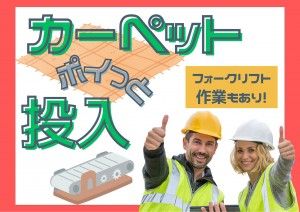 職種/仕事内容 | 仕事内容 【どんなお仕事なの?】 実際にオフィスなどで使用されていた 50×50cmのカーペットを ベルトコンベヤーに投げて頂く お仕事と、フォークリフト作業を お願いします! 【具体的な作業内容は?】 およそ50×50cmのカーペットを ベルトコンベヤーに交互に投げて 乗せていくだけの誰でもできる カンタンなお仕事です その他、フォークリフト作業もあり! (投入作業との割合は相談可) ・パレットに積まれているカーペットを 作業者のもとへ運ぶ ・粉々になったカーペットが入っている フレコンバッグを所定の位置に運ぶ *カウンターリフトを使用 一緒に働いている方がコツなどを やさしく教えてくれるので 安心して働くことができます! ライン作業ではないので、 製造未経験の方にも始めやすい お仕事です♪ 【残業はありますか?】 残業は1日1.5時間程度あります 予定がある日は 予定を優先してくださいね(*''*) 【カーペットの重さは?】 カーペットの重さは1~2kg弱 (砂糖の袋1~2個程度) 1人でも楽々持てます♪ 【未経験でも大丈夫?】 未経験でも大丈夫です! 異業種から転職してきて、 製造業未経験から始めた先輩が 多数活躍中! アパレル系などからの転職者もいます。 【どんな人が働いているの?】 20代、30代、40代、50代の 男性スタッフが活躍しています! 休憩はベンチで談笑したり、 一人でのんびりと休憩したり リフレッシュできます♪ 自分のペースで助けあいながら 作業をしています。 【休みはいつですか?】 基本土日祝休みです♪ 土日休みなので友人との予定が 組みやすいです! 長期休暇もあります! (年末年始、GW、お盆休み) 年間休日たっぷり125日♪ 【食堂はありますか?】 食堂はありませんが、 休憩室があります ウォーターサーバー、 コーヒーメーカー完備! なんと飲み放題です! 夏にはかき氷、 スポーツドリンク・冷たいタオル などがあります。 また、仕出し弁当の注文も可能! 休憩室の冷凍食品食べてもOK (激安!100円~200円) 【オシャレは出来る?】 はい!髪色髪型自由なので 自分らしく働けますよ♪ 【最短どれくらいで働ける?】 4日~1週間で働くこと可能です! 【職場の施設環境は?】 無料で制服・安全靴の支給あります 車・バイク・自転車通勤可 (無料駐車場完備) 休憩室あり 格安自動販売機あり シャワールーム完備 洗濯機完備 ベンチ有りの喫煙スペースあり 綺麗な鍵付きロッカー完備 【こんなワードにピン!ときた方に☆彡】 ・適度に体を動かして働きたい方 ・福利厚生の整った職場で働きたい方 ・残業をしてしっかり稼ぎたい方 ・モクモク作業で仕事ができる ・即面接!即スタートできます ・急ぎでお仕事をお探しの方 ・投入、もくもく軽作業 ******************* ヒューマンブリッジ派遣スタッフの年齢割合 ・10代 8% ・20代 30% ・30代 35% ・40代 20% 男女比 男性6:女性4 ******************* ハローワークには無い 新着のお仕事も多数掲載中!! 他のお仕事も見たい方は1番上の 「ヒューマンブリッジ株式会社」をタップ! |