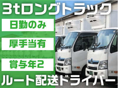 職種/仕事内容 | 仕事内容 =================== 来年3月まで大規模な採用計画あり✨ 迷っている方はぜひブックマークを! =================== 3tロング車で福岡市内のコンビニに 冷凍食品をルート配送していただく 日勤ドライバーを募集いたします。 ※乗車いただく【3tロング車】は 中型免許があれば運転できます◎ 【配送先】 佐賀、北九州、下関、飯塚、行橋、田川 【配送件数】 1日20件程度 長距離配送や力仕事はなく、 決まったルートなので覚えやすいです。 初めのうちは先輩と一緒に回りますので 未経験の方も安心してご応募ください。 【求人のポイント】 ✅対応範囲と安定性 九州全域に自社のセンターや拠点を複数持ち 配送ネットワークを整えています。 スーパーマーケット、小売店、コンビニ、 食品メーカーなど、幅広い顧客を 持っているため業務量が安定しています。 ✅未経験者応援 新入社員研修、安全・品質研修などがあり 中途採用者にもフォローがあります。 配送業が初めての方もご安心を。 ✅資格取得支援 運行管理者、整備管理者などの 業務上必要な資格取得に 会社が支援を行う体制があります。 希望者は大型・中型免許の取得支援も◎ 【安定した需要で福利厚生も充実】 ⭐月給にプラスで各種手当あり ⭐昇給年1回 ⭐賞与年2回 ⭐年間休日112日以上 ⭐休憩はたっぷり1時間30分 ⭐希望休制度あり ⭐お子さんの学校行事などによる休みOK ⭐配送が早く終われば、定時前の退社も可 ⭐資格取得支援制度(全額会社負担) ⭐退職金制度あり |