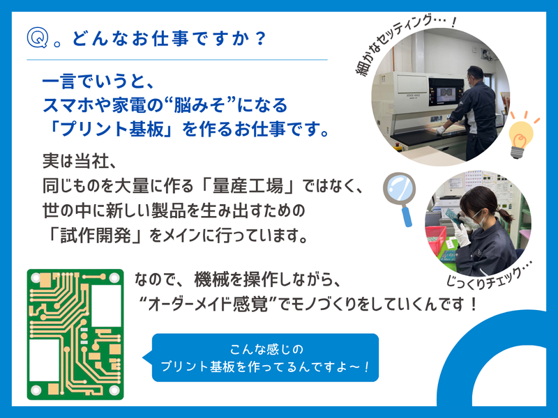 職種/仕事内容 | 仕事内容 \未経験から、ゆっくり、確実にプロへ。/ 私たちが作っているのは「プリント基板」。 スマホやデジタル家電、産業機器など、 あらゆる電子機器の 「脳みそ」になる大切な部品です。 「難しそう…」と思うかもしれませんが、 ご安心ください! 今活躍している先輩たちの 約9割が完全未経験 からのスタート! 当社は大量生産の工場ではないため、 「スピード」よりも 「一つずつ丁寧に取り組む品質」を大切にしています。 だからこそ、未経験からでも 焦らずじっくりと技術を身につけられる環境です◎ ✨ピーダブルビーの魅力ポイント✨ ✅ 賞与たっぷり計4.0ヶ月分! ✅ 実質年間休日125日!(基本土日祝休み&長期休暇あり) ✅ 9割が未経験スタート! ✅ スピードより品質重視のじっくり丁寧な研修 ✅ 生活を支える嬉しい手当充実 ✅ 20代~30代の若手活躍中! 同世代が多く馴染みやすいアットホームな職場✨ ✅ 転勤なし! 菰野町はもちろん、四日市や桑名・鈴鹿からも通勤便利◎ ■ どんな仕事? ┈┈┈┈┈┈┈┈•• 一言でいうと、 スマホや家電の“脳みそ”になる 「プリント基板」を作るお仕事です。 大きく分けて、やることはこんな感じです。 ① 機械のセッティング・操作(オペレーター業務) ② お客様のオーダーに合わせた微調整 ③ 機械のメンテナンス(薬品の液交換など) 【ここがポイント!】 ただ「ボタンをポチッと押して終わり」の 単純作業ではありません! 実は当社、 同じものを大量に作る「量産工場」ではなく、 世の中に新しい製品を生み出すための 「試作開発」をメインに行っています。 ※ベルトコンベアで流れてくるような「ライン作業」はありません◎ そのため、 「今日はこのデータに合わせてセッティングしてみよう」 「お客様の仕様に合わせてやり方を少し変えよう」など、 日々少しずつ違う作業をおこないます。 「毎日まったく同じことの繰り返しは飽きちゃう…」 「ちょっと手を動かして工夫する仕事が好き!」 という方にピッタリの環境です✨ ■ 未経験でも安心の育成ステップ ┈┈┈┈┈┈┈┈┈┈┈┈┈┈┈┈┈•• 「いきなり機械を任される…」 なんてことは絶対にありません! 時間をかけて、 あなたの適性に合ったポジションを見つけます✨ STEP1|入社~最初の2・3日 まずは業界用語などの基礎を少しだけお勉強。 その後、工場内のすべての工程をぐるっと見学します。 「プリント基板ってこうやってできているんだ!」 と全体像をつかんでください。 STEP2|適性を見て配属先を決定! 見学が終わったら、あなたに合った工程へ配属。 「コツコツ同じ作業を繰り返すのが得意そうだから検査工程へ」など、 一人ひとりの性格や適性を見て、 無理のない配属を行います。 STEP3|マンツーマンでじっくり研修(3〜6ヶ月) 配属後は、先輩が横についてイチからお仕事を教えます。 手順書(マニュアル)も用意していますが、 最初は先輩の真似をしながら少しずつ覚えていけばOK。 一つの工程の基本が身につくまで、 だいたい3〜6ヶ月。 急かさずゆっくり、じっくり育てます! ■ 気になる「ぶっちゃけ」Q&A ┈┈┈┈┈┈┈┈┈┈┈┈┈┈┈•• Q. 本当に製造業の経験がなくても大丈夫ですか? A. 全く問題ありません! 特別な資格もスキルも不要です。 最近入社した20代・30代の若手スタッフたちも 未経験スタートでしたが、 すっかり職場に馴染んで活躍しています✨ アットホームで質問しやすい雰囲気ですよ◎ Q. お休みはちゃんと取れますか? A. 実質「年休125日」です! 基本は土日祝休みで、 会社カレンダーの年間休日が120日。 そこに「計画有給消化日」が5日間組み込まれているため、 実質125日は確実にお休みとなります。 もちろん、GWや年末年始の連休もしっかりあります! Q. 変則的なシフトがあると聞いたのですが… A. 働きやすさの隠れポイントなんです! 基本は8:30〜17:30の勤務ですが、 工程によっては 7:00〜16:00や12:00〜21:00のシフト (2週間ごとの交替)をお願いすることがあります。 ※深夜の夜勤はありません! 最初は「朝早いな…」と思うかもしれませんが、 実は「通勤ラッシュの渋滞に巻き込まれない!」と社員からは大好評。 しかも、交替勤務には【1回500円】の交替手当がつくので、 ちょっとしたお小遣い稼ぎにもなりますよ♪ Q. 将来、家庭を持っても安心して働けますか? A. はい、社員の多くがマイホームを購入しています! 賞与はなんと年2回(前年度実績:計4.00ヶ月分)! さらに、家族手当(配偶者5000円、子ども5000円/人)も支給しています。 小さな会社ですが安定感はバツグン。 地元で腰を据えて長く働きたい方にピッタリの環境です。 ■ まずは工場見学でもいかがですか?✨ ┈┈┈┈┈┈┈┈┈┈┈┈┈┈┈┈┈┈┈•• 「どんな雰囲気なんだろう?」 「本当に自分にできるかな?」 迷っている方は、 まずは実際の現場を見に来てください! 働くイメージが湧いてから、 面接に進むかどうかを決めていただいて構いません。 あなたとお会いできるのを楽しみに