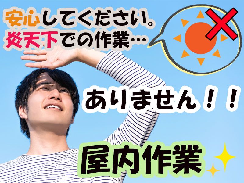 PR・職場情報 ▶冷暖房完備 ▶若い世代のスタッフさんが多数活躍中 ▶めずらしい2週間ごとの交替勤務 ▶未経験の方も歓迎 求人の特徴 \ 来社不要の電話面接 / ▽平日の日中~夜、土日祝でも面接枠をご用意! ▽働いている方でもご自身の予定に合わせて面談予約ができます! ▽まずは登録だけでもOK!あなたに合ったお仕事をご紹介します! \ 応募前の相談もOK! / 疑問や不安のある方、お気軽にご相談ください◎ 公式LINE:https://lin.ee/xcwbDnZ <<応募から就業までの流れ>> 応募から就業まで平均1~2週間!応募後すぐ働けます♪ STEP1 WEBにてご応募 *応募後に届く面接予約のご案内メールより面談予約をお願いします ※既にご登録いただいている方は書類選考のご案内メールをお送りします ↓ STEP2 面接担当とお電話で面接 *お仕事の詳細説明や簡単なヒアリングを行います ↓ STEP3 職場見学 *実際に働く職場を見学できます ↓ STEP4 入社手続き *契約内容の確認や安全教育等を行います ↓ 就業スタート! *入社初日は営業担当も同行します