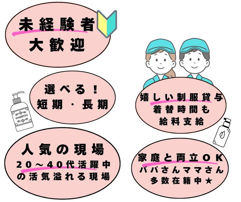 職種/仕事内容 | 仕事内容 軽量プラスチックの化粧品ボトル(中身は入っていない空き容器です)に印字された傷のチェックや、印字された文字の チェック検品や箱詰めのお仕事!! 作業内容は1週間もすれば余裕が生まれてくる方がほとんどなので安心してください✨ **************** <佐賀東部エリア>当社大人気現場‼ 【短期・長期スタッフ同時募集】 **************** ✅スグに働きたい方 ▶最短期日で入社日を調整致します! ✅入社時期を迷っている方 ▶年内スタート・新年スタートOK お気軽にご相談下さい(^^) ✅職場の雰囲気が気になる方 ▶見学のみOK!百聞は一見に如かず! 人気の現場を一度見に来て下さいっ 担当が同行しますのでご安心下さい♪ ✅短期か長期か迷っている方 ▶2か月短期のみOK! ほとんどの方が短期勤務後、長期勤務へ移行✨ ~実際勤務している弊社スタッフの声~ ◆元々短期勤務希望でしたが、働きやすい環境だったので長期勤務に切り替えて働いています♪(20代男性) ◆未経験スタートでしたが、シンプルな作業なので本当に1週間位でコツを掴めました。(30代女性) ◆フルタイム勤務でも年3回の長期休暇もあるから仕事と家庭とメリハリつけてお仕事できています✨(40代男性) ◆工場内が綺麗。冷暖房完備で夏も冬も働く環境は快適です!(30代女性) ◆工場カレンダーがあり残業も無いので、退勤後の予定が立てやすいです。日勤はここでお仕事して別の場所で週2日夜勤のWワークしています♪(20代女性) |
