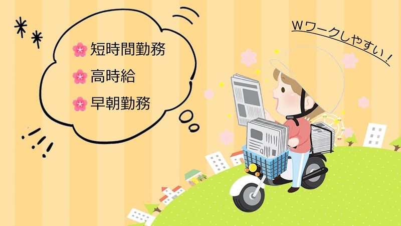 職種/仕事内容 | 仕事内容 信毎ふれあいネットにて 新聞配達スタッフ大募集! 早朝の短時間でサクッと働けるお仕事です。 ・未経験者大歓迎! ・早朝短時間勤務(1~2時間) ・早起きが得意な方 ・時間を有効活用したい方 ・嬉しい高時給 ・Wワークに最適 仕事内容 朝刊の配達業務です。 4:00頃から1時間~2時間程度のお仕事です。 エリアによって多少異なりますが、 大体80部~180部前後を担当していただきます。 原付バイクを使用した配達です。 収入は配達コースによって多少変動します 配達前に配達事前準備(チラシ封入)のお仕事も ありますので、稼ぎたい方はご検討ください。 おススメポイント 難しいお仕事ではありませんので初心者や 未経験の方でも安心して始められます。 配達ルートは毎回同じなので、一度覚えれば スムーズにお仕事を進められます。 早朝1時間~2時間程度の短時間勤務なので 空いた時間で稼げます。 Wワークもしやすい勤務時間帯です。 普通運転免許又は原付免許をお持ちであれば、 新聞配達の経験がなくても大丈夫です。 通勤について 勤務地は塩尻市になります。 塩尻市にお住まいの方はもちろん、 松本市や岡谷市、朝日村、山形村などからも 通勤可能です。 応募について 経験・年齢問わず活躍できるお仕事です。 新しいお仕事をお探しの方はぜひご検討ください。 ご不明な点等お気軽にご連絡ください。 お問い合わせだけでも大歓迎です。 ご応募お待ちしています。 |