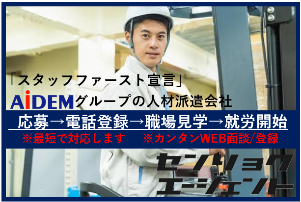 その他 | 備考 詳しい内容は営業担当より連絡致します。また、当社HPにてカンタンにWEB登録ができます。http://www.senage.co.jp/ 【当社は無期雇用を推進している派遣会社です!】 ★長期で働きたい方でも安心して働けます★ 労働法及び改正労働者派遣法で定められている個人抵触日にも有期雇用契約から無期雇用契約に転換することで、同じ職場で継続して就労が可能になります。当社はスタッフさんの希望に添えるように「無期雇用化」を推奨しております。※ご不明な点はお気軽にお問い合わせ下さい!! |