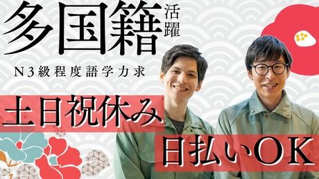 職種/仕事内容 | 仕事内容 無資格・未経験から始めるゴム製品の製造オペレーター ・原材料を機械への投入 ・機械の簡単なボタン操作 ・製品のチェック、仕分け ・梱包、箱詰め フォークリフトの免許がある方は運搬作業もあり! オープニング募集なのでみんな一緒にスタート! 経験や資格ナシでOK!未経験からでも始められる 単純作業のお仕事です! 〈オススメポイント〉 ・未経験歓迎 ・資格支援制度あり ・正社員登用あり ・研修制度充実 ・ミドル活躍中 ・即日勤務OK ・日払いOK ・外国人の方も多数活躍中 N3級程度語学力求 |