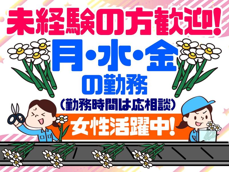 職種/仕事内容 | 仕事内容 スーパーマーケットに卸す生花の 加工作業をお任せします。 製造ラインの流れ作業で単純作業の 繰り返し◎ 未経験の方もスタートしやすいです! 主なお仕事は… ①お花の葉をとったり、茎を切ったり して下処理を行う ②お花を加工のラインにのせる ③お花を袋に入れる ④値段をつける ⑤バケツにつける ⑥作業が終わったら片付けやバケツの 水張りなど次回の作業の準備を行う。 まずは先輩が横について丁寧にお教えします。 分からないこと、困ったことがあっても すぐに聞けます! - 作業場内は冷暖房も完備! 生花を扱うので、暖かすぎる温度にはできませんが 夏は冷房、冬は暖房完備で快適に働けます◎ |