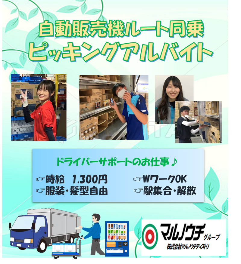 職種/仕事内容 | 仕事内容 ■■■未経験でも安心!■■■ ドライバーデビューを応援します! 配送件数少なめ&普通免許OK! 品川駅から車でラクラク送迎♪ ■■■■■■■■■■■■■■ 自動販売機の飲料水を補充するお仕事です! 「配送は件数が多いから大変そう...」 「中型の免許とか必要なんじゃ...」 など不安もあるかもしれません。 安心してください! ・配送件数は15~30件で体に無理なく働けます。 ・普通免許があればOKです!(準中型免許も会社全額負担で取得できるので安心してください!) 未経験からドライバーデビューをした若手が多数活躍中! 初めての方でもスムーズに独り立ちが出来る体制を整えています。 ぜひ一緒に働きましょう!  ̄ ̄ ̄ ̄ ̄ ̄ ̄ ̄ ̄ ̄ ̄ ̄ ̄ ̄ ̄ 【勤務地】品川駅集合! 帰りも配送ルートから駅までお送りするので、雨に濡れずに済みます! 駅にて担当ドライバーと待ち合わせ、移動は全て車になります。 平日限定の仕事、Wワーク大歓迎  ̄ ̄ ̄ ̄ ̄ ̄ ̄ ̄ ̄ ̄ ̄ ̄ ̄ ̄ ̄ (とある一日のスケジュール) 09:00 朝出勤したらドライバーさんと一緒に車に乗り込みます! 10:00 一つ目の現場に到着!ドライバーさんの指示に従い飲み物を箱の中にピッキング! 11:00 次の現場に向かいます!午前中に10件ほどまわります! 12:00 午前のお仕事終了!お昼ご飯を食べながらドライバーさんと談笑! 13:00 午後のお仕事スタート!午後も10件ほどまわります。 15:00 現場で段ボールを片付けたりします!難しい仕事はないので未経験でも安心! 17:00 現場が終わったらトラックに乗って拠点に戻ります! 朝と同じ駅までドライバーさんに車で送ってもらい、本日の業務終了! |