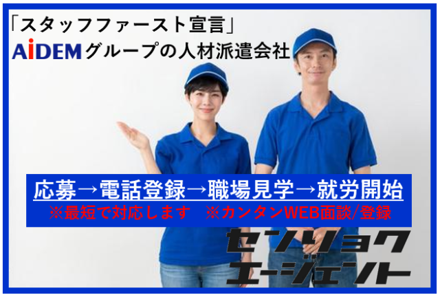 選考プロセス | 応募方法 応募方法 ◎Jobギアからご応募(応募フォームから) (電話応募の場合は、e-アイデム(イーアイデム)を見たとお伝え下さい) ↓ ◎営業担当との登録・面談・カウンセリング (新大阪オフィス、もしくはご自宅の近くまで伺います) お仕事の紹介、内容の説明をさせていただきます。 所要時間は30分から1時間程度になりますので ご都合の良い日時をお聞かせ下さい。 ↓ ◎営業担当と一緒に職場見学 ↓ ◎最終確認・就労決定! お仕事が出来そうか続けられそうか判断していただき 勤務を希望されると言うことであれば 就労開始の日程調整などを行います。 就労前はもちろんのこと! 就労後も同じ専任の営業担当が しっかりとフォロー★ばっちりとサポート させていただきますので安心して働く事ができます。 連絡先住所 ☆現地登録 開催中☆ 〒532-0011 大阪府大阪市淀川区西中島6-7-3 第6新大阪ビル 10F 連絡先TEL 0120-924-552 採用担当 戦力エージェント株式会社 大阪支店 大阪西グループ 担当者:採用担当 求人番号1357-347 |