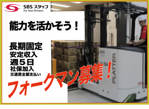 職種/仕事内容 | 仕事内容 おススメのお仕事/フォーク作業/トピックス情報/長期・週5日のお仕事 みどりの駅から路線バスで20分の場所 リーチフォークで窓などの建材の入出庫作業 重量は、20キロ~1トンと重いものは多くありますが、重量物を手作業で運ぶなどはございません。 メインはリーチフォークでの作業となりますが、カウンターフォークもお願いする場合があります。 重量物の扱いの為、乗務経験のある方を求めています。 勤務は、月曜~土曜の中で5日勤務可能な方となります。 通勤は、最寄り駅からの路線バス、またマイカー・バイク通勤や自転車通勤もOKとなります。 ・休憩室完備/冷蔵庫・電子レンジ・湯沸し器完備 ※お弁当を温めてお食べいただけます。 ・個人ロッカー完備 ・洗面所、男女別完備 ・屋内原則禁煙(喫煙スペースあり) その他 ※残業、平均1日1時間程度あり ※有給休暇取得しやすい ※事前の休み調整相談可 ※服装自由 ※倉庫内スタッフの人数は、30名ほどで、アットホームな雰囲気のお仕事先となります。 固定安定でお仕事しやすいお仕事先となっています。 フォーク作業が8割、補助の手作業が2割ほどのお仕事となっています。 今回、募集は1名となっていますので、気になる方はお早めにご応募をお願いします。 ご応募をお待ちしています! [こんな人が活躍] 黙々と出来る方が活躍中! |