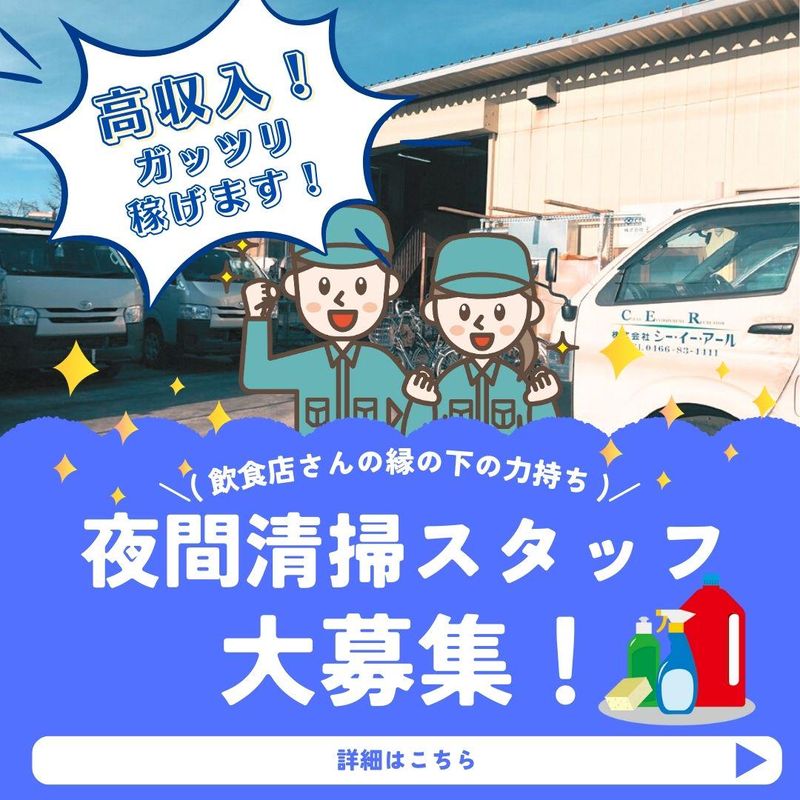 職種/仕事内容 | 仕事内容 ⭐飲食店さんの縁の下の力持ち! ⭐残業はほぼナシ!! ⭐夜の時間を活用して ガッツリ稼ぎたい方必見! ―――――――――――――――――― 【仕事内容】 飲食店さんの厨房排気設備の お掃除・メンテナンスをお任せします。 天井内や屋根上のこともあり 脚立に上ったりするメンバーは 小柄な方が活躍しています! ―――――――――――――――――― ☆営業終了後の店舗に伺うので お客様との対面はあまりありません。 ☆お掃除は段取りが大事です♪ 埼玉工場に集合し、 ハイエースで現場まで行きます。 ☆未経験・無資格から始められるお仕事! 最初は丁寧に教えるので安心して下さい! ★ダブルワークでも、週3日など定期的な勤務が可能な方であれば歓迎! |