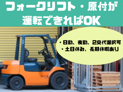 対象となる方 | 求めている人材 【必須要件】 ・フォークリフトの免許をお持ちの方 ・原動機付自転車免許(もしくは普通自動車免許など、原動機付自転車を運転できる免許)をお持ちの方 ◆年齢不問 ◆学歴不問 ◆フリーターさんOK 年齢の条件と理由:あり(※22時~翌5時は例外事由2号・18歳以上(労働基準法)) |
