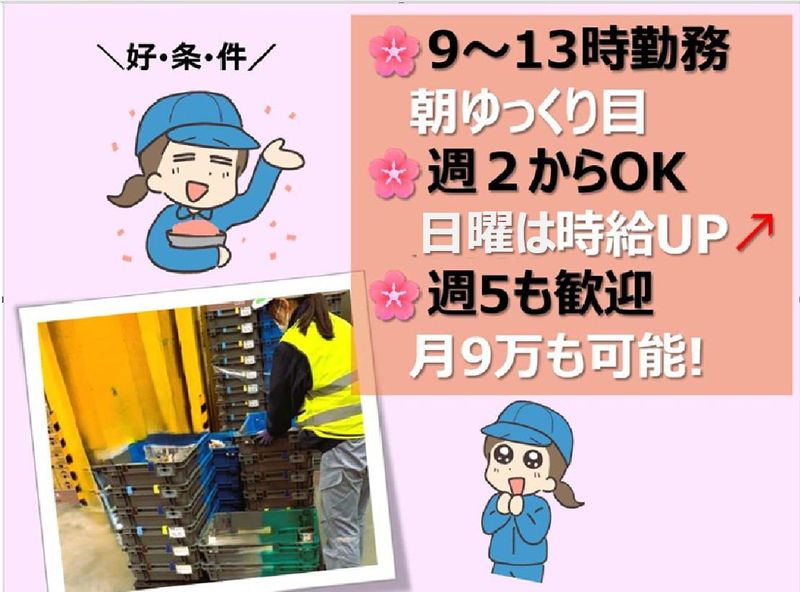 職種/仕事内容 | 仕事内容 【武蔵浦和駅から近く】ペタっとシール貼りやピッキング。簡単作業でお小遣いを稼いじゃいましょう!1週間どの曜日でもOK ╲求人のPOINT/ *未経験歓迎!年齢不問 *週2日~、扶養範囲可 *土日もOK╲時給最大1326円/ *食料品を扱うきれいな環境です *バイク・自転車通勤OK ―――――――――――――――――― ✅仕事内容 職場はチェーン店の商品を扱う流通センター 短時間・軽作業のどなたでも取り組みやすいお仕事です。 ⭐具体的には ◇シールの貼り付け作業 商品ごとに決まった位置に一つ一つ貼っていきます。 はじめは遅くても大丈夫です。 ”丁寧に”を心掛けてくださいね。 ◇ピッキング 出荷リストの商品を集める作業です。 ケース単位でひと箱は10Kg程度。 フォークリフトのスタッフが 回収するので運搬はありません。 ⭐パートさんも、学生も活躍中 社員も一緒に現場で作業をしますので 丁寧にご指導します。 困った時は何でも相談してください。 「子どもが帰るまでに働きたい」 「軽くWワークしたい」 「家事と無理なく両立したい」 ╲そんな方にピッタリです/ 気軽にご応募ください ―――――――――――――――――― ✅朝は9時から 出勤時間がゆっくりなので、 お子さんの送迎がある方も安心です。 短時間で軽めの仕事なので パートをお探しの方にもおススメです!! ✅週2~5日までOK ご希望の曜日を教えてください! 倉庫は年中無休で稼働しているので 1週間どの曜日でも大歓迎です。 「どんな仕事かな?」「できるかな?」 とご心配でしたら、 まずは週2日位からスタートしてみて 日数を増やすこともできますよ。 ✅日曜は”時給最大1326円”にアップ 週末まとめて稼ぎたい方に朗報! 日曜は時給がお得!! 土日2日間でも、月約4万円可能です ※詳しくは「給与」の項目。 働き方は柔軟に対応しますので 面接の際に、気軽に相談して下さい。 ―――――――――――――――――― ✅電車でも通勤便利! 武蔵浦和駅から線路沿いに10分位。 途中にプロ野球チームのグランドがあり そこから5分掛かかりません。 (バイク・自転車通勤もOK) 目の前がスーパー、隣はコンビニなので 仕事帰りの買物も便利です! |