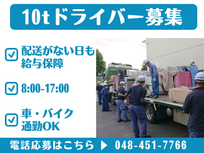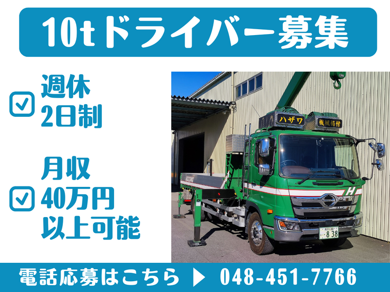 職種/仕事内容 | 仕事内容 \\10tドライバー募集!// ⭐月収40万円以上可能☆ ⭐週休2日制(土日祝) ⭐配送のない日も給与保障あり! ≪お任せするお仕事≫ ⏩精密機器・電気機器などの 重量物の輸送 ⏩イベント会場等への展示品の輸送 ⏩食品、医療品のルート配送 など! ⭐日によって運ぶものや場所が 変わるので飽きずに続けられます! (配送先は関東一円) ⭐安全を重視し毎月テーマを決めて 取り組んでいます。 採用されたら金一封贈呈! ≪株式会社ハザワについて≫ 当社の特色として、重量物の運搬が 売り上げの半分を占めています。 輸送物の運搬から据え付け作業、 解体作業まで行うこともあります。 |