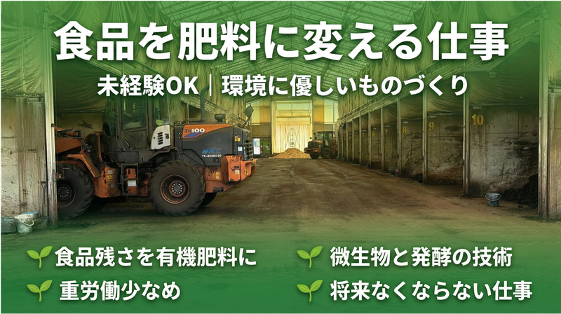 職種/仕事内容 | 仕事内容 【この仕事はこんな方に向いています】 ・人間関係に疲れてしまった ・急かされる職場が苦手 ・黙々と作業する方が気が楽 ・でも単純作業だけでは物足りない この仕事は ラインスピードに追われる工場ではありません。 作業は自分のペースで進められ、 困ったときだけ周りと相談する落ち着いた環境です。 志望動機は不要。 「話を聞いてみたい」だけの応募も歓迎しています。 【どんな作業か】 食品残さを発酵させて肥料を作る工場です。 難しい機械操作はなく、 作業は順番通りに覚えていけば問題ありません。 最初は全員同じスタートです。 ・受け入れ作業 ・袋詰め ・発酵の確認 ・作業手順の調整補助 1〜2週間ほどで流れを理解できる内容です。 【この仕事の特徴】 ・ライン作業ではありません ・常に動き回る仕事ではありません ・怒号が飛ぶ雰囲気はありません 落ち着いて働きながら、 「こうした方が楽になるかも」を歓迎する職場です。 経験よりも 現場を少し良くしようとする視点 を大切にしています。 【慣れてきたら】 無理にリーダーにはしませんが、 後輩へコツを伝えたり、作業を整える役割も任せていきます。 「責任だけ増える」働き方にはなりません。 【待遇】 ・月給25万円以上可(経験考慮) ・賞与年2回 ・残業ほぼなし ・年間休日122日 【事業について】 食品を資源へ変えるリサイクル事業です。 景気の影響を受けにくく、長く続く分野です。 【通勤圏】 成田市/香取市/旭市/茨城方面から通勤可 【年収例】 420万円(入社2年) 650万円(工場長) |