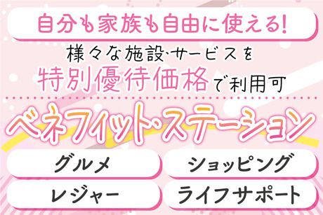 待遇・福利厚生 | 【保険制度】 雇用保険、労災保険、健康保険、厚生年金 【福利厚生】 待遇・福利厚生 【福利厚生】 ・社会保険完備 ・交通費全額支給 ・毎週仮払いOK(規定あり) ・有給休暇 ・制服貸与 ・髪色自由 ・自転車、バイク、車通勤OK ・駐車場完備 ・無料送迎バスあり ・休憩スペースあり ・空調完備 ・社割あり ・正社員登用制度あり ・紹介キャンペーン ※ご紹介くださった方1名につき6万円進呈(規定) 【その他福利厚生】 ・定期健康診断 ・キャリアアップ支援制度 ・ストレスチェックの実施 ・子ども手当あり ・結婚、出産、入学祝い金あり ・退職金制度あり ※各々、社内規定に基づく ★トーコーで働くと利用できる福利厚生サービス「ベネフィット・ステーション」! グルメやレジャー、ショッピングだけでなく 育児や介護などライフイベントに関わるものまで、 【約140万件以上】の各施設・サービスを特別優待価格にてご利用いただけます。 スタッフさんはもちろん、ご家族の方もお好きなだけ利用できます。 |