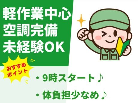 職種/仕事内容 | 仕事内容 \ここがポイント/ ☆9時スタートで朝はゆったり出勤♪ ★空調完備&座り作業なしで快適環境◎ ★未経験歓迎!カンタン梱包作業です! *・。・。*・。・。*・。・。* <仕事内容> 製品の出荷前の梱包と準備をお任せします。 作業は決まった手順で進めるだけなので安心♪ ・製品を梱包材で丁寧に包みます ・箱に入れて、出荷用パレットへ積込み ・出荷伝票を貼って仕上げて完了! 重い物の取り扱いは少なく、体の負担も軽め◎ クリーンルームではないので着替えの必要なし。 動きやすい私服または作業着で勤務OKです♪ *・。・。*・。・。*・。・。* |
