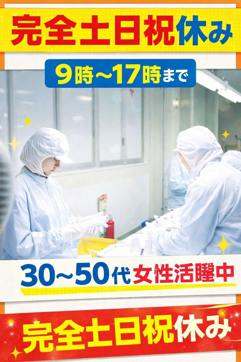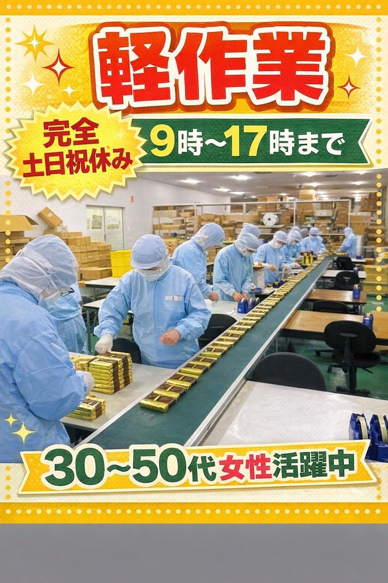 職種/仕事内容 | 仕事内容 【★おすすめポイント★】 ✅主婦・子育て中の女性活躍中 ✅9時~開始◎ ✅17時きっかりで帰宅 ✅冷暖房完備のキレイな職場 ✅座り作業もあるための負担少なめ ✅未経験でもすぐ覚えられる簡単作業 ✅土日祝休みで家庭との両立◎ ✅30代~50代の女性スタッフ活躍中 ✅近隣にお住まいの主婦さん多数在籍 ―――――――――――――――――― 【✅仕事内容】 物流センター内にて 入浴剤の軽作業をお願いします。 <具体的な仕事内容> ◎商品の梱包 ◎箱詰め ライン作業になります!! スピードはゆっくり! 軽作業なため、体の負担が少なめです! 扱う商品も軽いモノしかないため安心♪ 現在働いているスタッフの 約75%が未経験からスタートしています。 コツコツ作業が好きな方におすすめのお仕事です。 ―――――――――――――――――― 【✅女性が働きやすい職場】 現在約15名のパートさんが働いており、 そのうち13名が女性スタッフです。 ◎家の近くで働きたい ◎家事と両立できる仕事が良い ◎無理なく長く働きたい どんな理由でも大歓迎です♪ ―――――――――――――――――― 【✅勤務地】 静岡県榛原郡吉田町 ※東名高速道路吉田ICから車で4分 駐車場完備/車通勤OK ―――――――――――――――――― 【✅勤務時間】 9:00 ~ 17:00 (実働7時間/休憩60分) 残業:なし ※3ヶ月に1回30分程度 ―――――――――――――――――― 【✅休日】 完全土日祝休み ―――――――――――――――――― 【✅給与】 時給1,250円~1,525円 ―――――――――――――――――― 【✅応募資格】 ◎未経験OK ◎学歴不問 ◎主婦・主夫歓迎 ◎フリーター歓迎 ◎ブランクOK ◎WワークOK ◎30~50代女性活躍中 ―――――――――――――――――― 【✅こんな方におすすめ】 ◎家事や育児と両立して働きたい方 ◎座り仕事を探している方 ◎簡単な軽作業から始めたい方 ◎コツコツ作業が好きな方 |