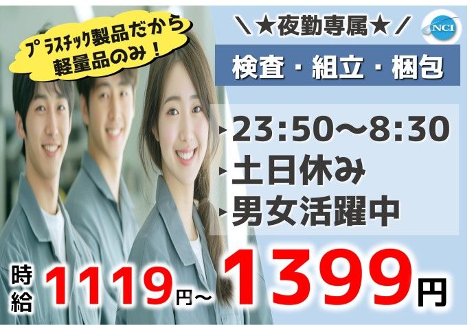 【夜勤専属★】プラスチック製品の製造補助♪深夜割増ありでやる気もUP!