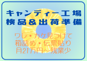 職種/仕事内容 | 募集背景 全力案件 仕事内容 「毎日ちゃんと定時で帰りたい」 「難しい仕事はちょっと不安…」 そんな方に選ばれている、 お菓子を“見るだけ・詰めるだけの【軽作業】です。 ◆ 8:15~17:15/ほぼ定時退社 ◆土日祝休みで予定が立てやすい ◆重い物なし・9割が未経験スタート ▽どんなものを作っているの? おなじみの穴のあいたキャンディーなどお菓子です。 ▽どんな作業? ・割れや欠けを見つけて取り除く作業 ・チェック済みの製品を袋詰め ・指示書通りに商品ケースを移動 ・出荷用の伝票を貼り付け ※重量物は一切ありません! ・考えごとしながらでもできる、手順が決まった軽作業 ・全国のお客様が安心して食べられる最後の砦があなたのチェックです♪ ▽残業はあるの? 普段は少なめで、1分単位の集計で月4~5時間。 プライベートも大事にしたい方、 生活リズムを大切にしたい方にオススメです。 ☆担当者より☆ あの黄色い穴あきアメの製造工場です。 工場の壁もあの色です、気分がアガリます。 ニオイや気温に敏感な方にもおすすめできるクリーンな環境です。 【応募資格】 学歴不問・年齢不問! 転職回数も問いません! 志望動機なしで面接承り中です。 落とす面接はしません! ブランクある方もご相談ください! 【未経験でも大丈夫!】 前職:事務・販売・専業主婦など、未経験からスタートが9割以上♪ 【こんな人が活躍】 20代30代40代幅広い年齢層のスタッフが在籍しています。 《主婦Aさん》17:30には帰宅して、18時には夕飯作りスタート [厳しさ] 安心安全な品質を守るため、細かくチェックしています。 ・作業服の確認で異物混入を防止 ・温度・湿度の適正管理で美味しさキープ ・資材は立会い・目視・記録で厳重管理 ・毎日抜き取り検査で外観や重量・水分をチェック ・包装から梱包まで目で見てしっかり確認しています [こんな人が活躍] 20代30代40代幅広い年齢層のスタッフが在籍しています 重いモノも難しい工程もないので性別関係なく活躍できるお仕事です |