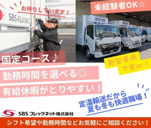 職種/仕事内容 | 仕事情報 ● 仕事内容 大手コンビニの各店舗に、お弁当や飲料、スイーツなどの食品をルート配送していただきます。1日に2稼働、合わせて20件程度の配送です。固定ルートで無理のない短距離配送なので、体力的な負担も少なくご自分のペースで働けます。休憩もしっかり1h以上取れます! 詳しくは面接時に説明致します。 決まったルートで計画的に 決まった店舗への納品になるため、基本的に巡回ルートが決まっており、配送にかかる時間の目安が立てやすいです。営業所近くのエリアの店舗をご担当いただくので、長時間運転はほとんどありません。計画的に働きたい方におすすめです! 給与前払い制度あります☆ スマホで簡単な申請をしていただくことで、給与の前払いが可能となります(入社後最初の給料日までが遠い場合に便利です) 急な出費などお困りごとがありましたらお気軽にご相談ください☆ ※振込手数料は会社負担です 有休のとりやすい環境♪ 希望のお休みを取りやすい環境です。希望シフト提出時に、お気軽にご相談ください。お子様の学校行事も参加したい主婦(夫)の方や、プライベートの時間も大切にされたい方、家族と過ごす時間を大切にされたい方におすすめです。プライベートとお仕事のメリハリをつけて、健康的に楽しく働きましょう! 東証プライム上場グループ SBSフレックネットがお届けするのは、お客さまの生活に欠かせない食品。会社の強みである輸配送全国ネットと、低温管理ノウハウは、お客さまの安心安全な「食の当たり前」を支えます。3温度帯に対応できる会社として、業界トップクラスの品質と実績を持つSBSフレックネットで誇りをもってお仕事しませんか? |