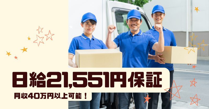 アピールポイント: ✅高日給×ロイヤリティ一切ナシ! ロイヤリティがなしで日給保障制なので物量に関係なく、安定した高報酬が得らえるのも嬉しいポイントです! ✅人間関係のストレスが苦手な方にも安心!! 代引きなどが無いため、人と対面する機会が少なく、配送に集中できる環境です◎ ✅軽い荷物がメイン! 化粧品や本などの軽い荷物がメインなので、シニア・女性も活躍しています♪ ✅マンツーマンの研修 最初の3日間はベテランドライバーとマンツーマンで実地講習! 独り立ち後は少ない荷量からスタートなので安心! (少ない荷量でも日給保障は21,551円です◎)