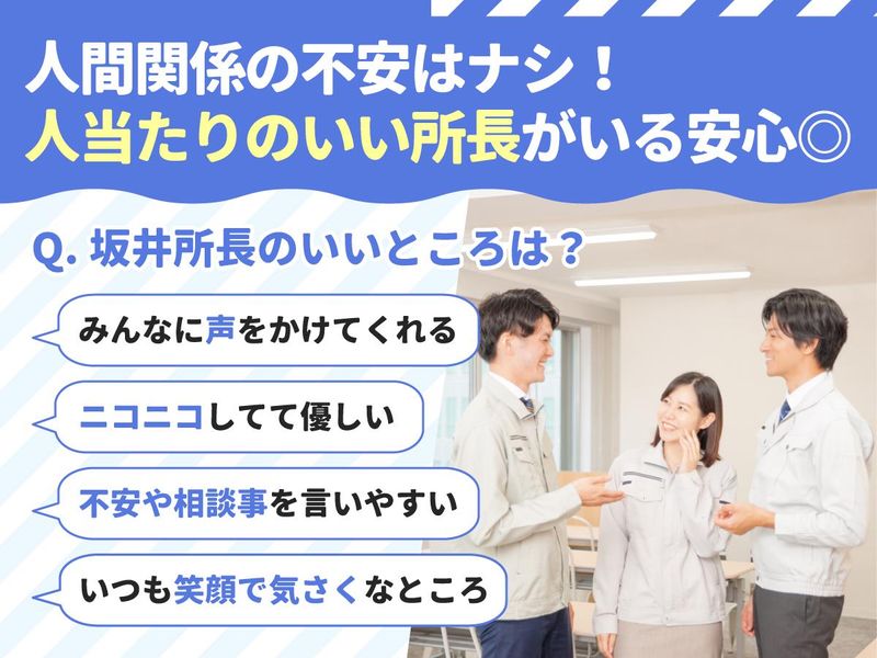 職場環境・雰囲気 | 職場環境 定着理由1位は『所長や仲間が凄く良い人だから』 介護や接客等、異業種出身者が「過去を否定せず今を評価してくれる」と語る風土です。 干渉はないけど困った時は助け合える『ほどよい距離感』が自慢。 集中できる環境であなたの『これから』を応援! 喫煙所:喫煙所あり(屋外) |