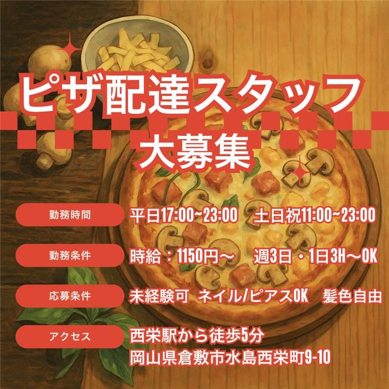 職種/仕事内容 | 仕事内容 ▼こんな仕事をお任せします▼ ◆ピザやサイドメニューのデリバリー ◆チラシのポスティング ◆接客・店内作業 配達はお店の近隣住宅がメインです★ 1~2週間で業務に慣れます◎ 注文が入ったら、地図で確認して配達! 最初は先輩と一緒なので安心です♪ 「私にもできるかな…」 「初めてのアルバイトだけど大丈夫かな…」 と不安に思うかもしれませんが、 面倒見の良いベテラン先輩が1つ1つ丁寧に 教えていくのでご安心ください♪ 未経験やアルバイトデビュー大歓迎♪ 最初は笑顔でご挨拶が出来ればOK! 難しい業務も一切ないのでご安心下さい◎ ▼簡単な入社後の流れについて▼ ①デリバリー方法やバイクの乗り方など、 簡単な研修からスタート ②当店が用意したバイクで配達スタート 初めは先輩に同行するので安心です◎ ②1~2週間を目安に1人でチャレンジ 覚えるスピードは人それぞれなので、 不安なことは何でも教えてください♪ |