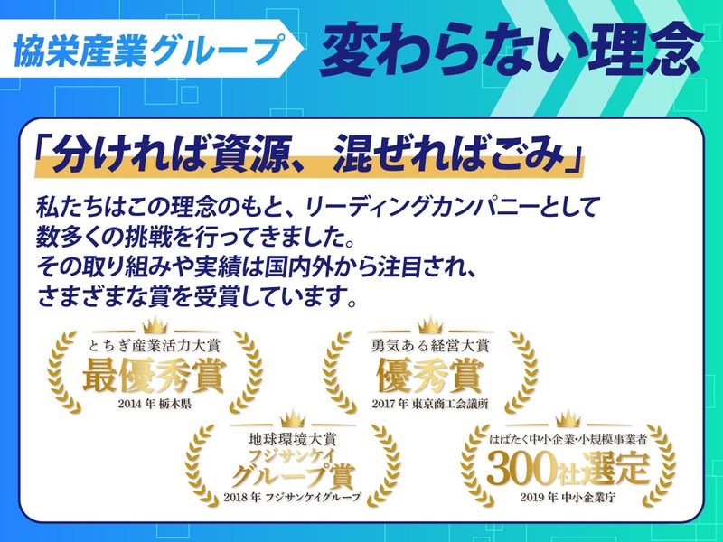 職種/仕事内容 | 仕事内容 【年齢不問*フォーク免許を活かせる製造】 〇 4日勤務で2日休み!実質年休134日! 〇 福利厚生充実!家族手当・住宅手当あり 〇 入社2か月目から、”月収28万円”可能 \身体の負担少なめで安心/ 「まだまだ現役で頑張りたい・・・!」 そんな中高年・ミドルさんも応援! =================== 【仕事内容】 ・大型機械のオペレーター業務 ・フォークリフトでの原料運搬作業 ・消耗部品の定期交換、メンテナンス ~複数人作業だから製造未経験でも安心~ 分からないことがあればすぐに質問できる! 製造職・正社員復帰も大歓迎です! <流れ> 1)プラスチック廃材などの原料を 原料置き場から機械の前まで運搬 (フォークリフト使用) 2)ボタン操作で機械と関連設備を稼働 3)原料を手作業で選別し機械へ投入 4)設備の運転状況を目視で監視 5)製品が満杯になったら、 フォークリフトで交換 6)出来上がった製品を計量後、 荷札および作業日報に記入 7)計量後製品を所定の置き場まで運搬 ※原料の加工が終了するまで 、 3)~7)を繰り返します。 ※作業人数:1人~3人 (原料により作業人数変更あり) <関わった原料はこんな製品に!> ・各種容器 ・高機能繊維 ・食品トレー ・海外有名サッカークラブチームの ユニフォーム原料 など =================== 【当社について】 あらゆるプラスチック樹脂をリサイクルし 用途別に原料を生み出す、 高度なリサイクル技術で エコな社会の実現を目指しています。 ~ 国内トップクラスのリサイクル技術 ~ 技術開発力を認められ国内だけではなく、 世界からも取材依頼が殺到(年間30件!!) <ホームページ>http://kyoei-rg.co.jp/ |