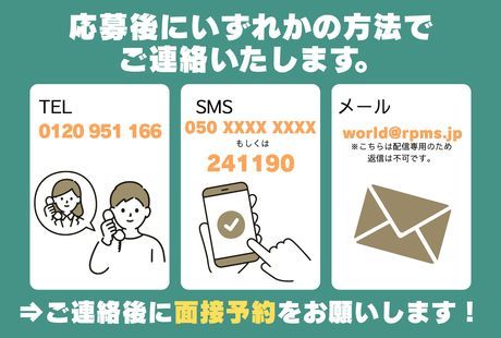 選考プロセス | 選考プロセス ▼応募後、面接予約(面接日調整)について 以下よりご連絡させていただきます。 (1)電話:「0120-951-166」 (2)メッセージ(SMS): 「241190」または「050」から始まる番号 (3)メール:「world@rpms.jp」 【面接】 履歴書(写真貼付)、職歴書を事前に送付いただきます。 ※1~2回を予定。ざっくばらんにお話ししましょう。 【内定】 内定までは2~3週間を予定しています。 【入社】 ※面接、入社日はご相談に応じます。 ※応募書類は返却致しません。 ご提出頂きました個人情報は選考の結果に関らず、 当社にて適切に廃棄致します。 ▼オンライン面談について スマートフォンとWEB環境があれば 自宅から簡単に面接可能! 無料ZOOMアプリを使用して面接を実施! ダウンロード方法や使用方法等は 事前にお伝えしますので 詳細が分からない方もご安心下さい。 応募方法 【応募】 電話・WEBよりご応募ください。 |
